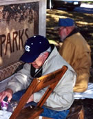 Artist Bart Forbes and contractor, Les Darnell, install mosaic signs in the small triangular parks on Mockingbird Lane at East and West Greenway Boulevards.